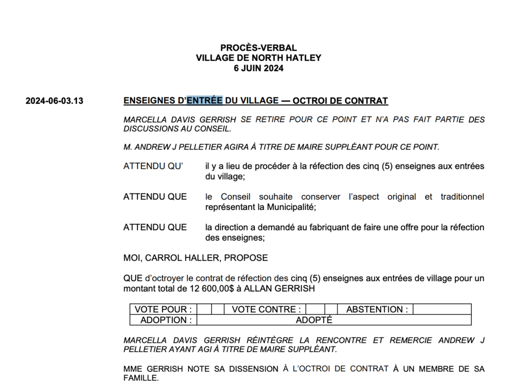 Le 18 juin 2025, je publiais un article questionnant le retour des enseignes de bienvenue à North Hatley. Rappelons que le contrat pour ces enseignes a été octroyé lors de la séance du conseil du 3 juin 2024, pour un montant de 12 600 $, à M. Allan Gerrish.