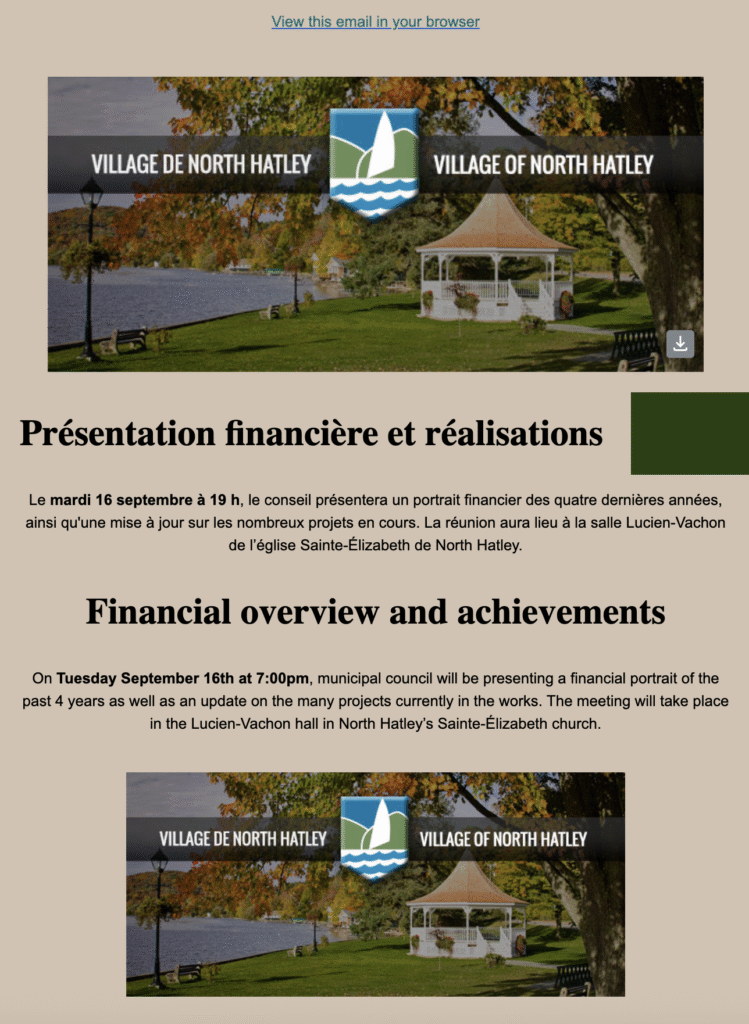 Fortunately, my friends informed me that there would be a presentation of North Hatley’s 2022-2025 financial reports this evening, as I did not receive an invitation by email. However, I am indeed subscribed, but my last email from the municipal administration was the “Entre nous” newsletter.
