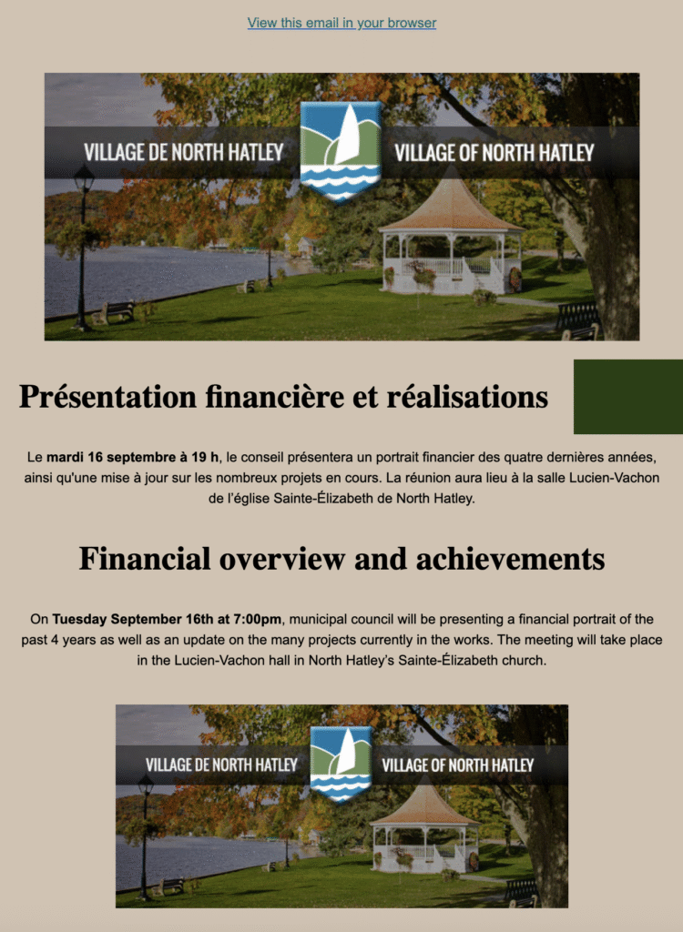 Heureusement que mes amis m’ont informé qu’il y avait une présentation des rapports financiers du village de North Hatley des années 2022 à 2025 ce soir car je n’ai pas reçu d’invitation par courriel. Pourtant, je suis bel et bien abonné, mais mon dernier courriel de l’administration municipale est celui du bulletin “Entre nous”.