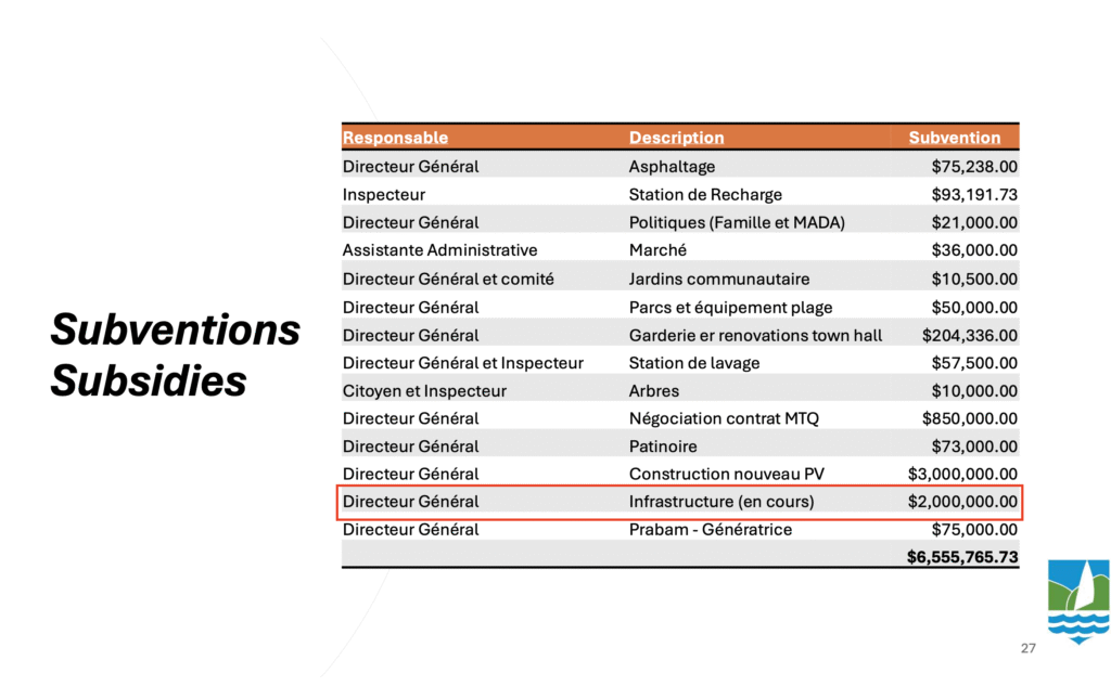 • D’après le conseil municipal du 11 août dernier, la subvention pour la démolition et la reconstruction du bâtiment de la plage Pleasant View était toujours en cours. Si c’est le cas, il s’agit d’une autre subvention de 3 000 000$ qui n’est pas encore obtenue.