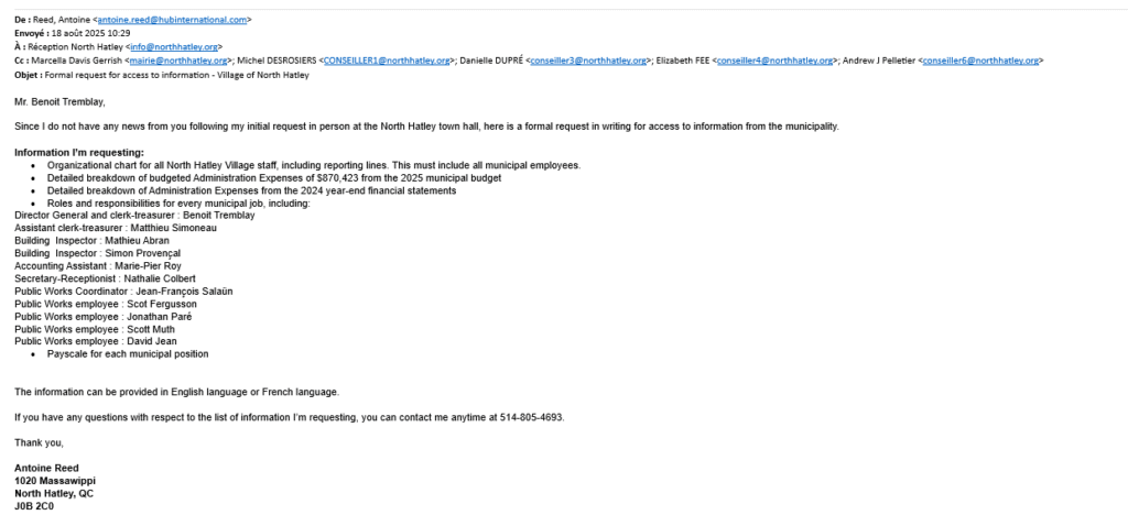 Après avoir tenté en vain d’obtenir des informations auprès du très aimable employé de la mairie, j’ai compris que rien ne pouvait se faire sans envoyer un courriel. Cette fois-ci, j’ai adressé une demande officielle d’accès à l’information à Benoit Tremblay, responsable de l’information à North Hatley, qui se trouve être également directeur municipal et président de la commission électorale pour les prochaines élections. Vous trouverez ci-joint l’intégralité de cette correspondance. J’ai même reçu un courriel dès le lendemain m’informant qu’il s’occupait de ma demande.