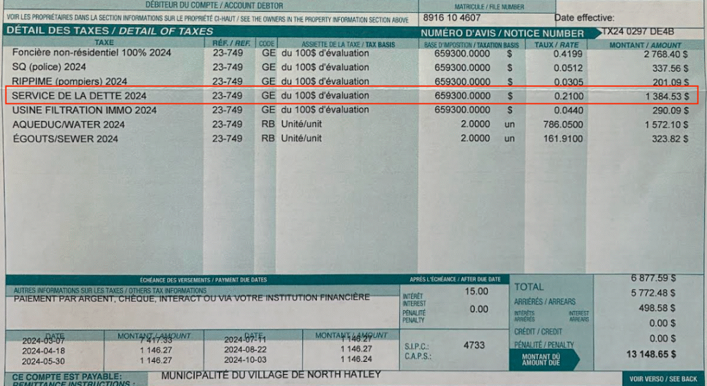 D’après mon analyse, l’administration municipale de North Hatley n’a pas remboursé la dette en 2024 malgré qu’elle a perçu l’argent par le biais d’une taxe « SERVICE DE LA DETTE » auprès des citoyennes et citoyens au montant de 0,2100$ par 100$ d’évaluation.  Alors, où est allé cet argent?