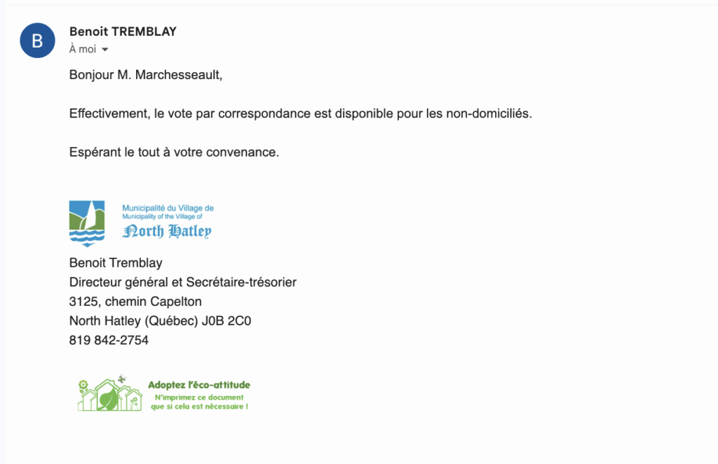 Certains citoyens habiteront à l’extérieur de North Hatley lors des élections municipales du 2 novembre prochain et ne pourront pas se rendre voter sur place. Cependant, il existe le vote par correspondance en tant qu’ électeur non domicilié. Si vous êtes admissible, vous pouvez voter par correspondance au plus tard le 10e jour précédant celui du scrutin.