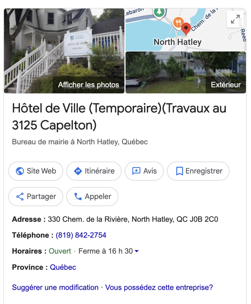 Imprimé d’écran de la fiche Google actuelle de l’hôtel de ville de North Hatley