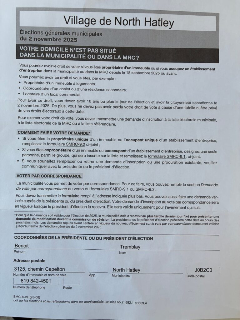 Afin de vous éviter de vous heurter à un bureau fermé, je vous invite à changer l’adresse du Président d’élections pour le 330 Chem. de la Rivière, North Hatley, QC J0B 2C0.