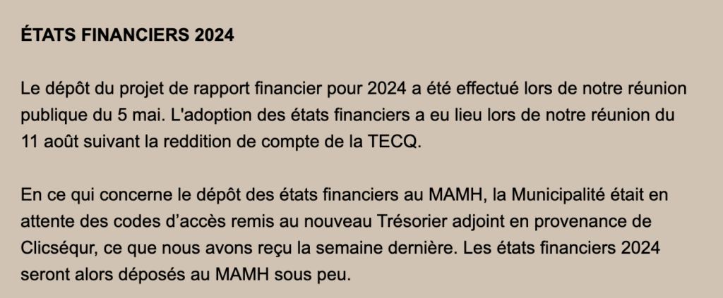 Bulletin municipal du 1e octobre 2025 pour expliquer les raisons des retards du dépôt des états financiers 2024 dus au 30 juin dernier.