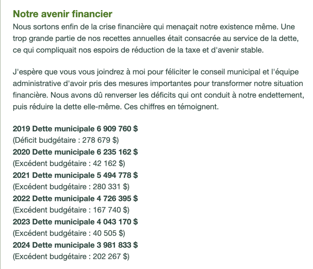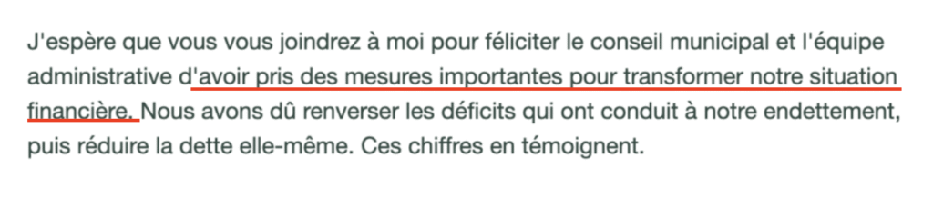 Par contre, se féliciter le conseil et les élus pour avoir pris des mesures importantes pour transformer la situation financière de la municipalité me paraît quelque peu fallacieux. À vous d’en juger!