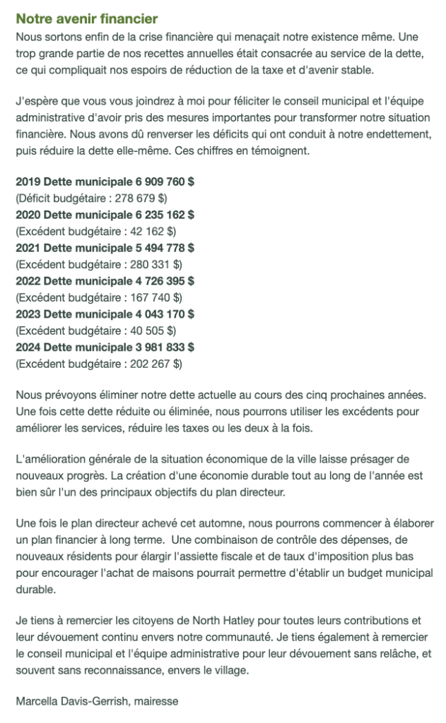 Premièrement, la municipalité mentionne les états financiers 2024 à la ligne 13 de la page 26. Je tiens à préciser que ces documents ne sont toujours pas disponibles aux citoyens. Difficile de suivre des lignes et des pages de rapports inexistants. En date du 2 octobre, les rapports financiers ne sont toujours pas déposés au ministère ni sur le site web de la municipalité. Seuls les budgets sont disponibles.