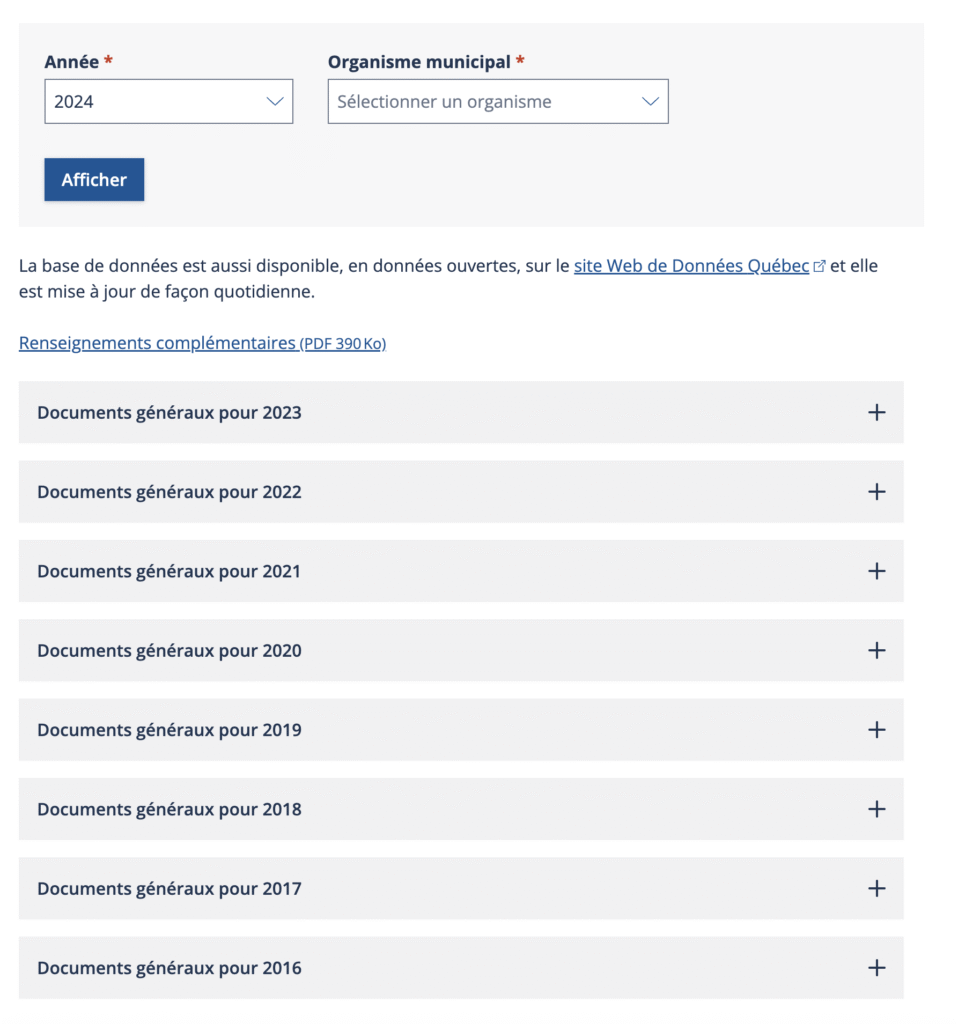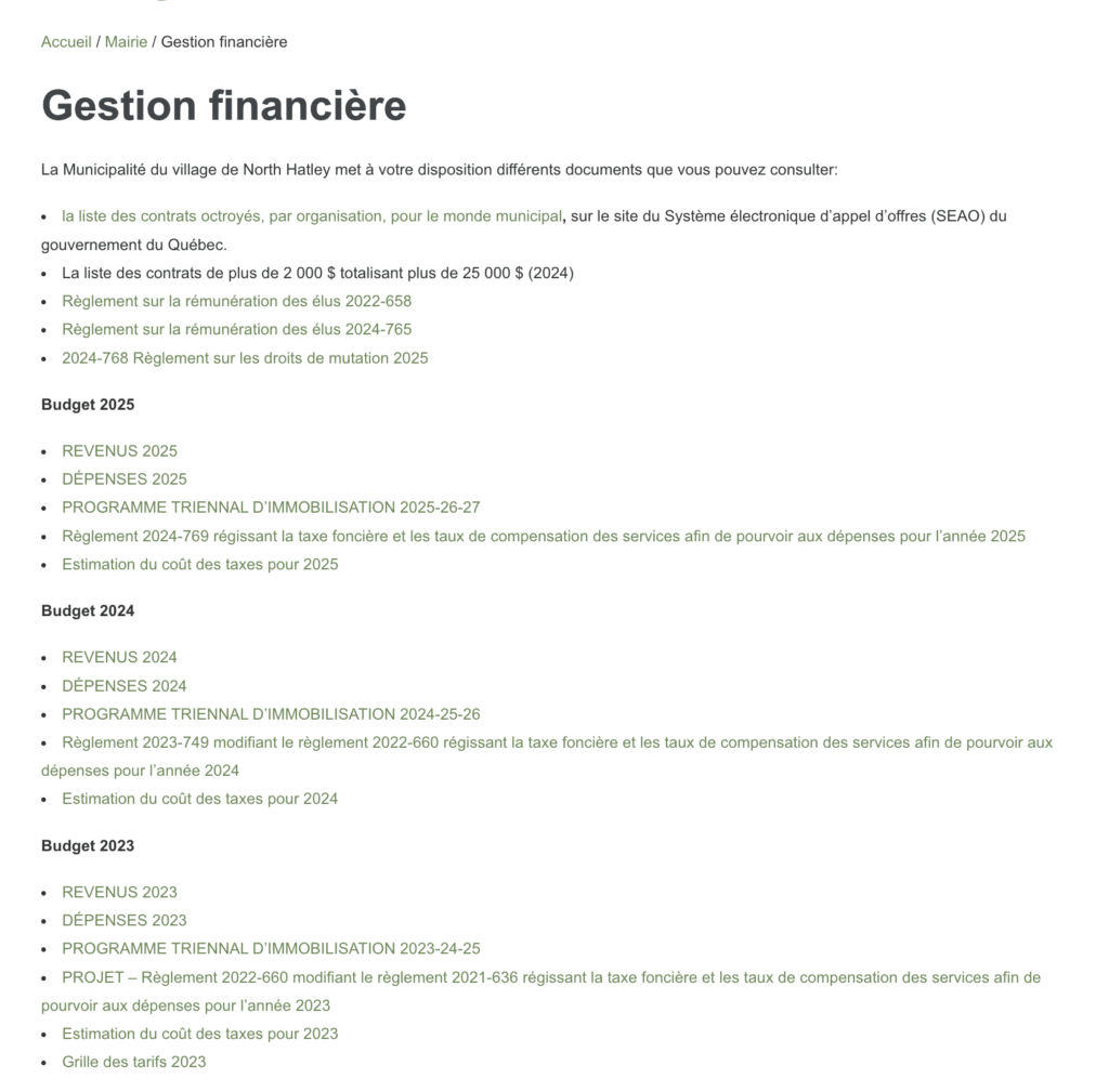 Rapports financiers 2024 non disponibles sur le site de la municipalité au 2 octobre 2025.