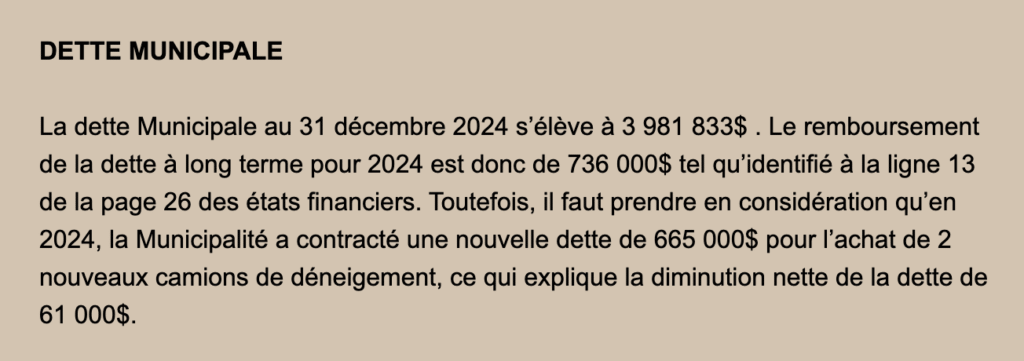 Peut-on affirmer j’ai remboursé ma dette municipale à la hauteur de 736 000$ ou de seulement 61 337$? Certes, je dois continuer de rembourser une dette totalisant 3 972 170$ pour 2025 même si j’ai des camions neufs.
