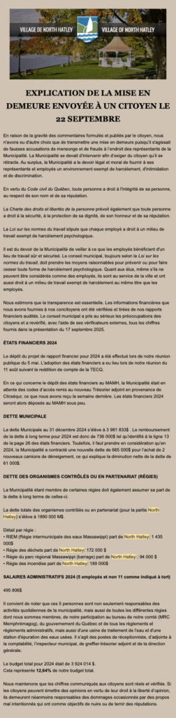 Dans son bulletin diffusé le 1er octobre à 13 h 11, la Municipalité de North Hatley cherche à justifier deux éléments : le retard du dépôt de ses rapports financiers et la mise en demeure transmise au citoyen M. Reed.