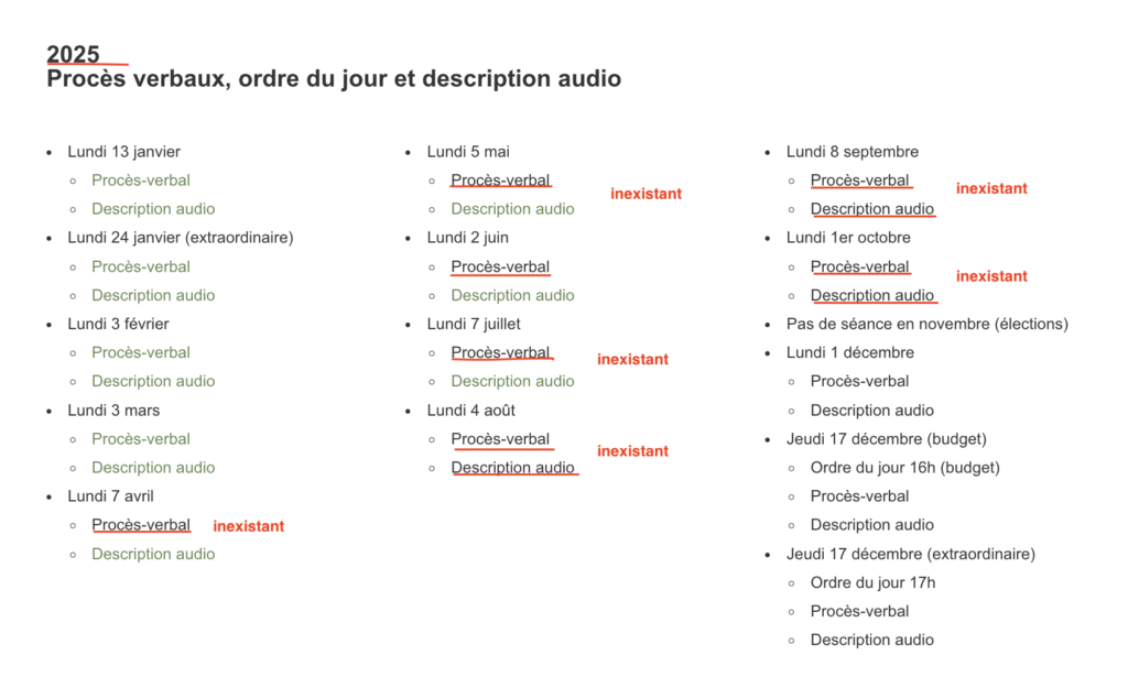 - Plusieurs réunions du conseil municipal de 2025 sont répertoriées sans lien vers les procès-verbaux ou les enregistrements audio, contrairement à la pratique attendue dans le cadre d’une gouvernance municipale transparente.