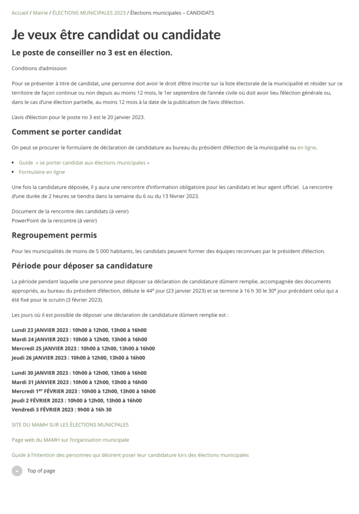 À moins de 30 jours du scrutin, aucune information officielle sur les élections municipales de North Hatley n’est disponible sur le site web de la municipalité. Seule la page de l’élection partielle de 2023 y figure encore, sans mise à jour sur le vote de 2025 ni sur le président d’élection. (source officielle).
