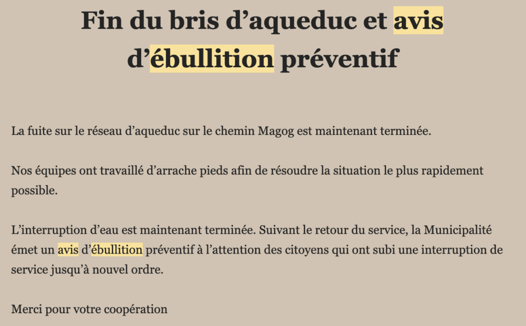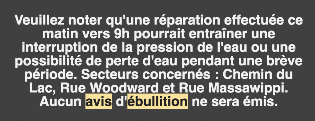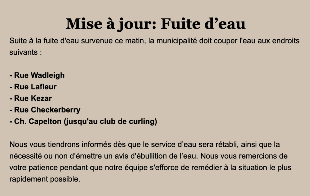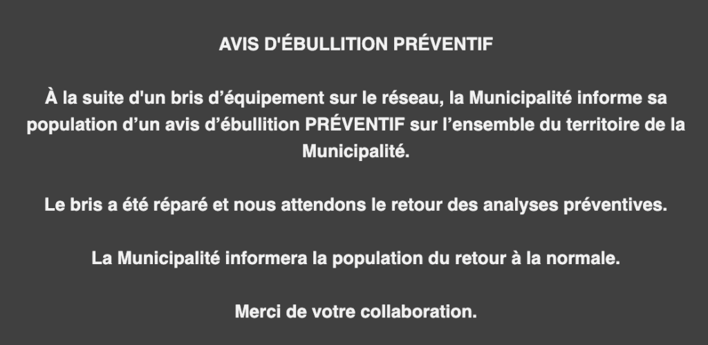 Les bris d’aqueduc semblent de plus en plus fréquents menant à de nombreux avis d’ébullition d’eau. Est-ce que notre réseau d’aqueduc nécessite remise en état importante? Si oui, est-ce que cela est prévu dans nos budgets? La loi exige que cela soit reflété dans les rapports financiers de la municipalité.